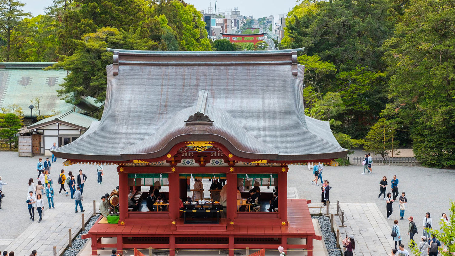 Walk the tree-lined Dankazura approach to Kamakura's most important Shinto shrine — built in 1063 and sitting at the geographic and spiritual heart of the city.