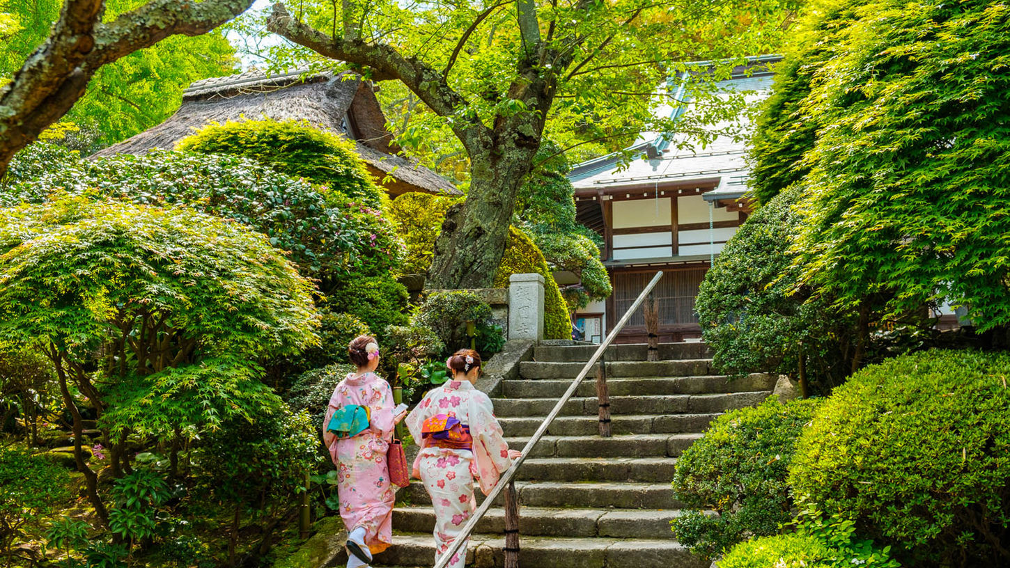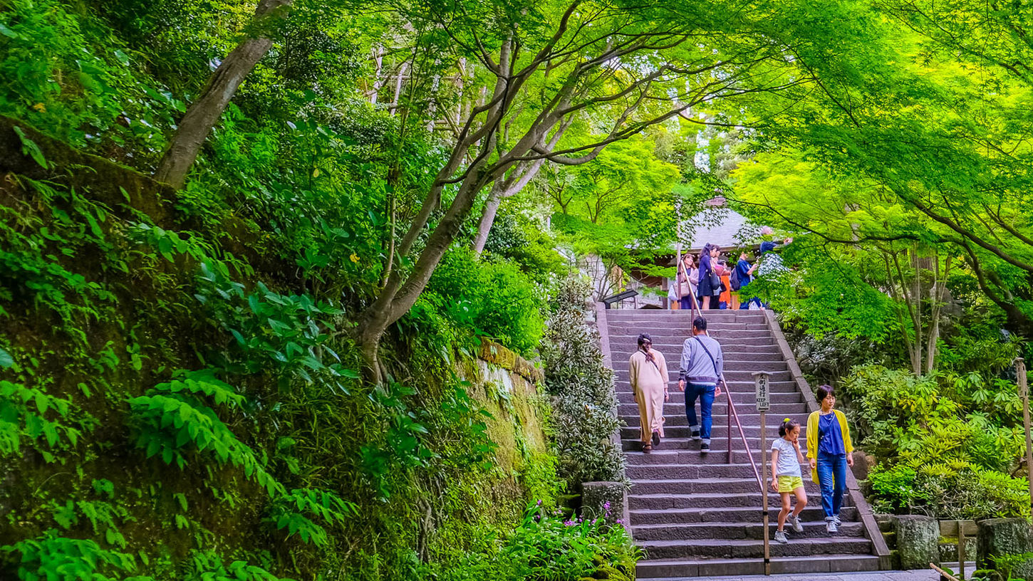 Kamakura's oldest temple, founded in 734. Climb the moss-covered stone steps to the main hall housing three sacred Kannon statues — with views toward Mt. Fuji on clear days.